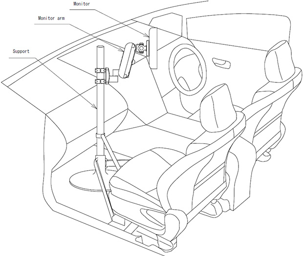 For bringing a monitor into an automobile, installation metal fittings are available for use, including “handle-hook metal fittings,” “suction cup type for a windshield,” and “the method of attaching an arm to a support strut fixed between the floor and ceiling of an automobile, etc.”