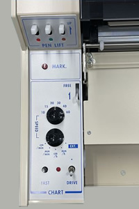 The recorder comes standard with a polarity changeover switch, a recording-paper fast-forward switch, a recording-paper rewind knob, a recording-paper-end alarm, and a superimposed event marker that makes it possible to place a mark arbitrarily on a recording line.